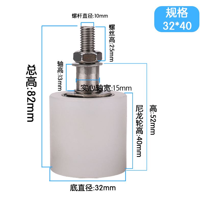 產(chǎn)品主要參數(shù): 規(guī)格:32*40 材質(zhì):SUS 304不銹鋼 總高:82MM 尼龍輪高:40MM
